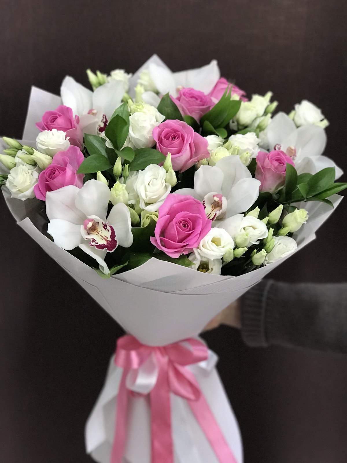 This bouquet is made up of extra class flowers: Pink Roses, White Eustomas and white or pink orchids. Lot's a foliage and a nice packing complete the highest quality image.