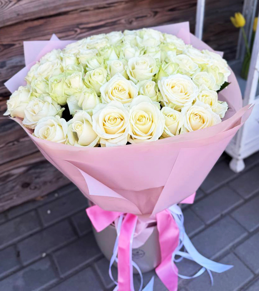 White roses are symbols of faithfulness and purity in Russian/Ukrainian culture. These roses are of the long size stem and are imported from Holland or Ecuador. The other strong tradition allows presentation of only bouquets with the odd number of flowers.Height 35-39 inch (80 -90 cm)