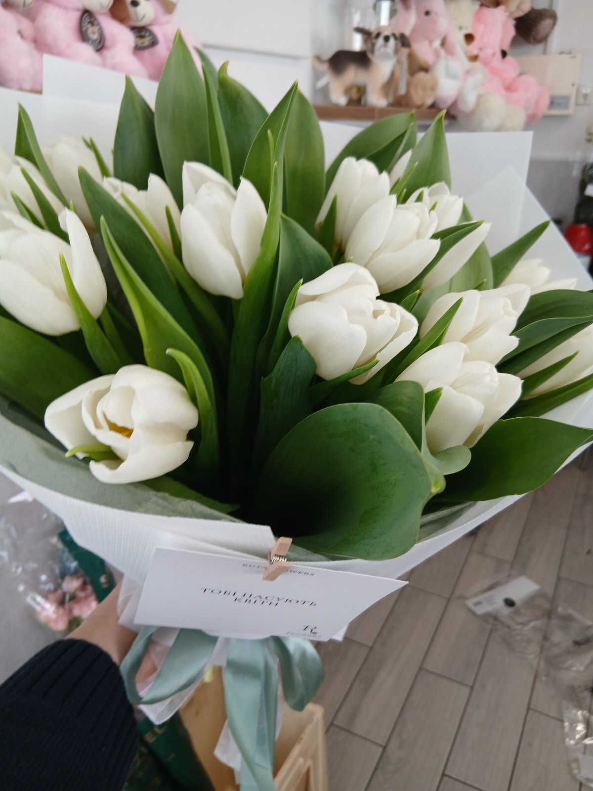 Our photo shows 51 tulips bouquet, but you could choose any other number of flowers for your bouquet.