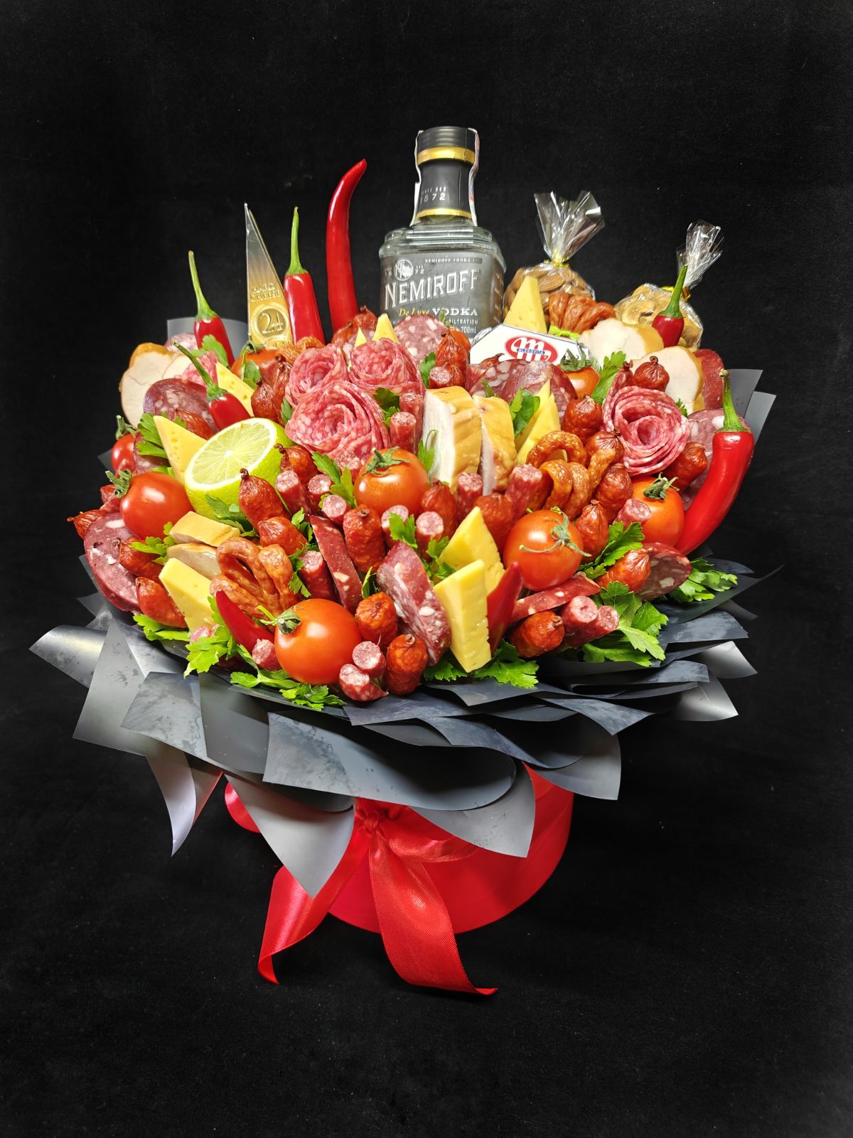 Прекрасний подарунок чоловікові до дня народження, ювілею, будь-якого сімейного свята. Набір з кількох видів ковбасок найвищої якості, сир, нарізка, горiшки... I все це прикрашають чудові стручки червоного перцю.