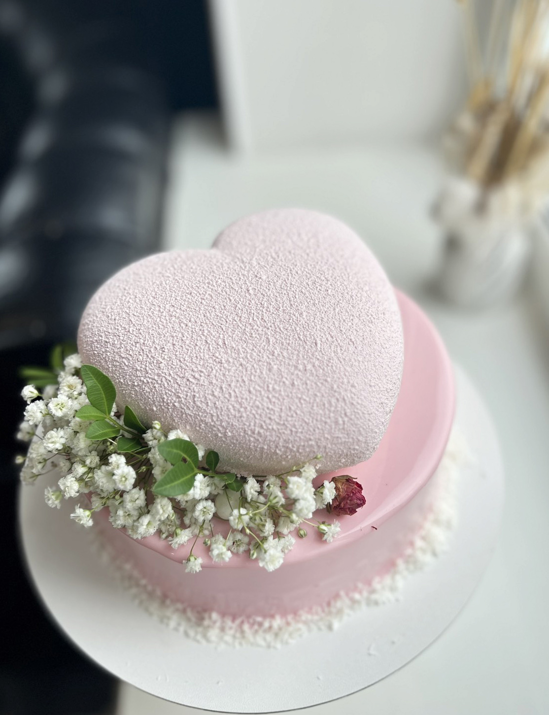 This cake is made with light cream mousse with the: a thin bisсuit layer as a base of the cake, a white chocolate and cream mousse, different fillings.