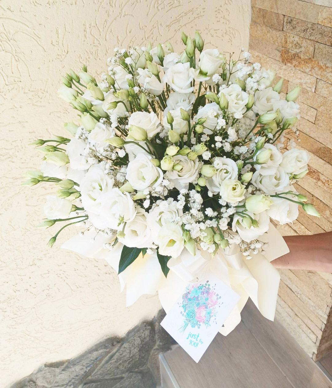Even several branches make it posh and luxurious. With some buds open and some waiting for their time to blossom and please you. Every branch has several little ones with leaves and the bouquet of 15 flower branches looks really large and luxury. And you can imagine the look of eustoma bouquet if you take more.