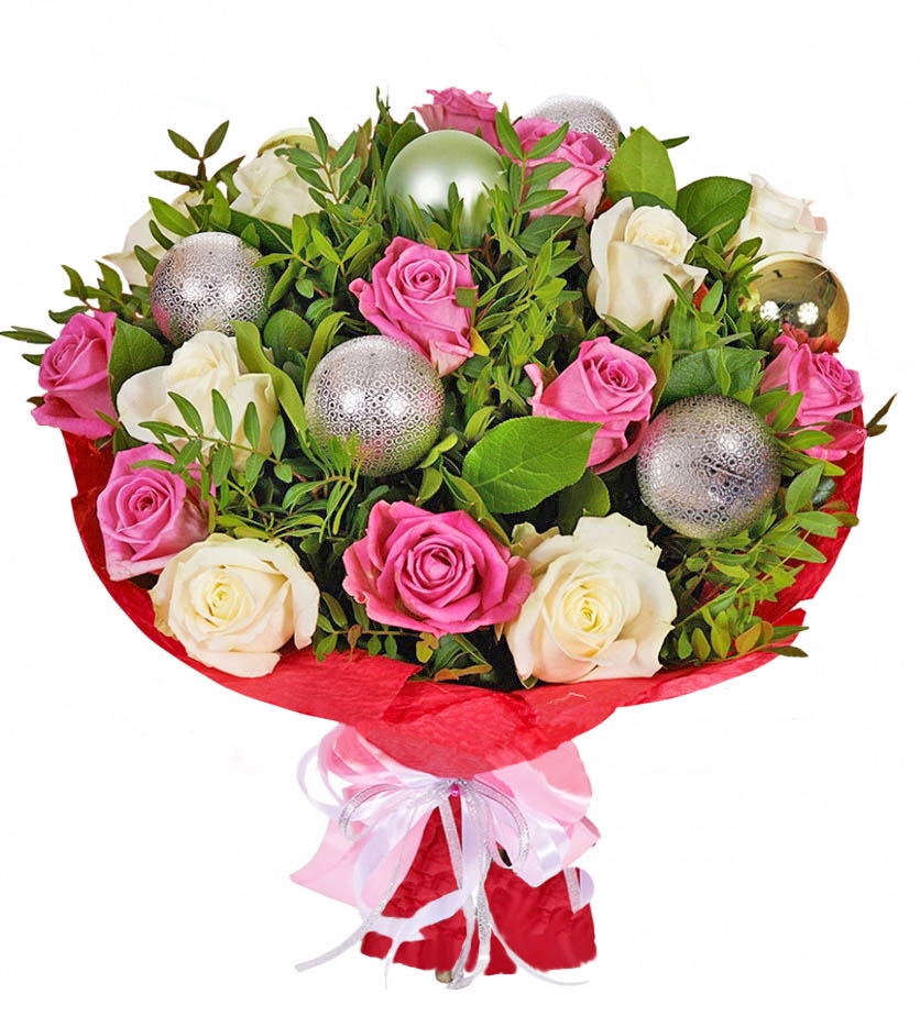 A beautiful Christmas bouquet of 15 white and pink roses and a christmas decoration balls.
