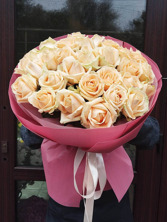 At this page can be ordered bouquets of peach roses of 60-70 cm stems.