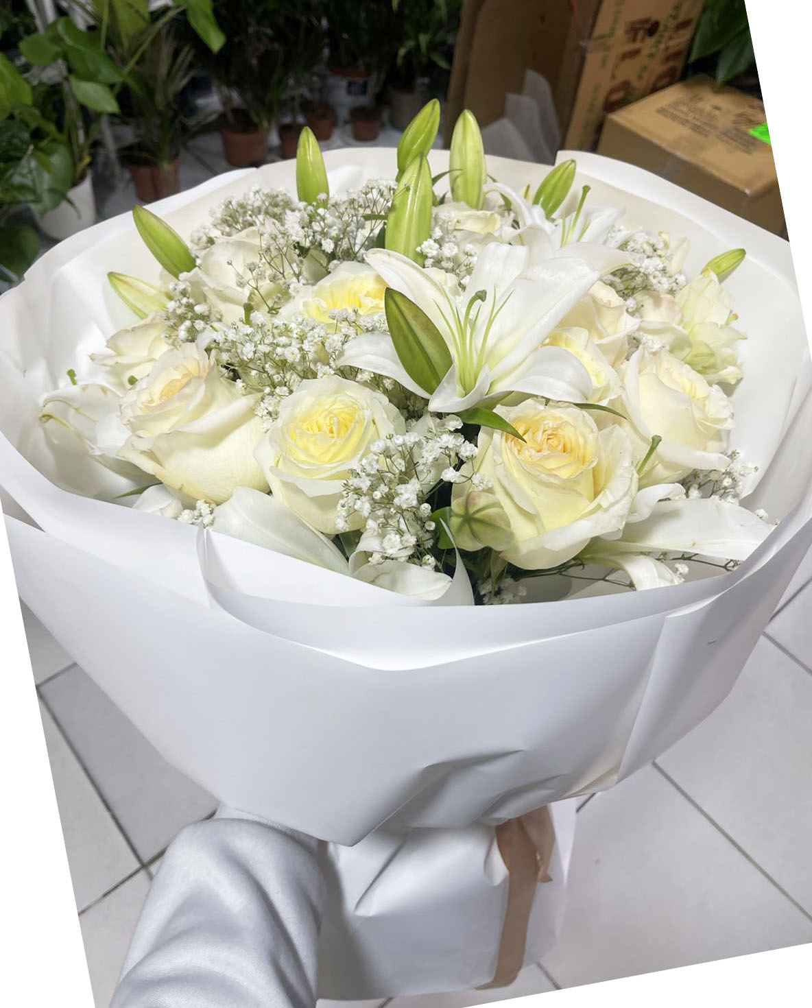 11 x snow-white Roses 3 bunches of Lilies