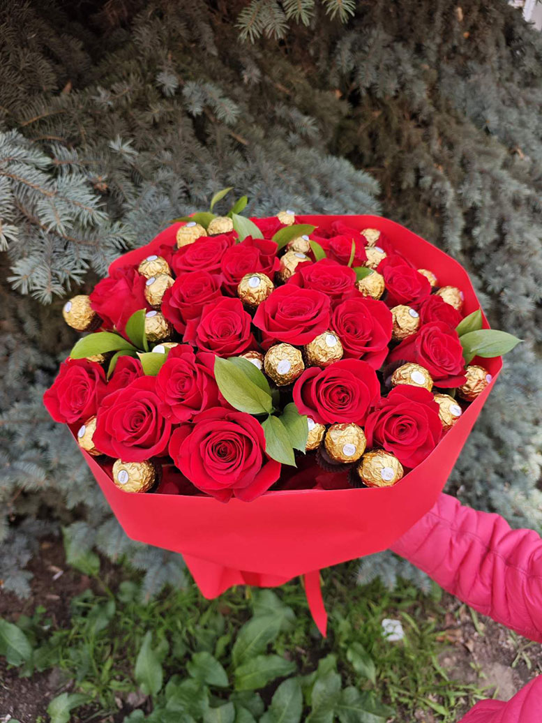 Our photo shows 15 roses +16 Ferreros bouquet, but you could order a smaller or a bigger one.
