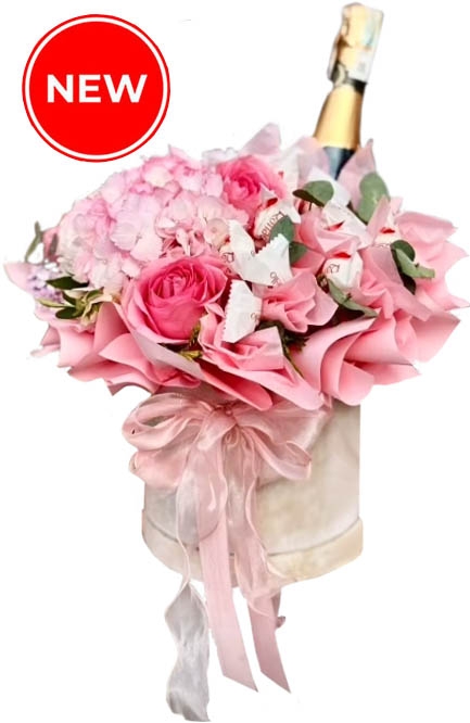The Hat Box arrangement is divided into 2 parts. One part is filled with a fresh beautiful flowers and the other half has a bottle of Ukrainian champagne and Raffaello candies.