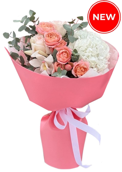 This bouquet includes a white or pink hydrangea (depending on availability), a white orchid... There are also roses in two colors: white and pink, or orange-pink, as it is at our photo. These spray roses with a peony-like shape are of are of a sort, called "Juliet". However if we don't have this particular variety in stock, we'll use other sorts of roses, that aren't less spectacular and beautiful. For example, Silva Pink, or Misty Bubbles sorts, or... there are a huge number of incredibly beautiful peony roses.