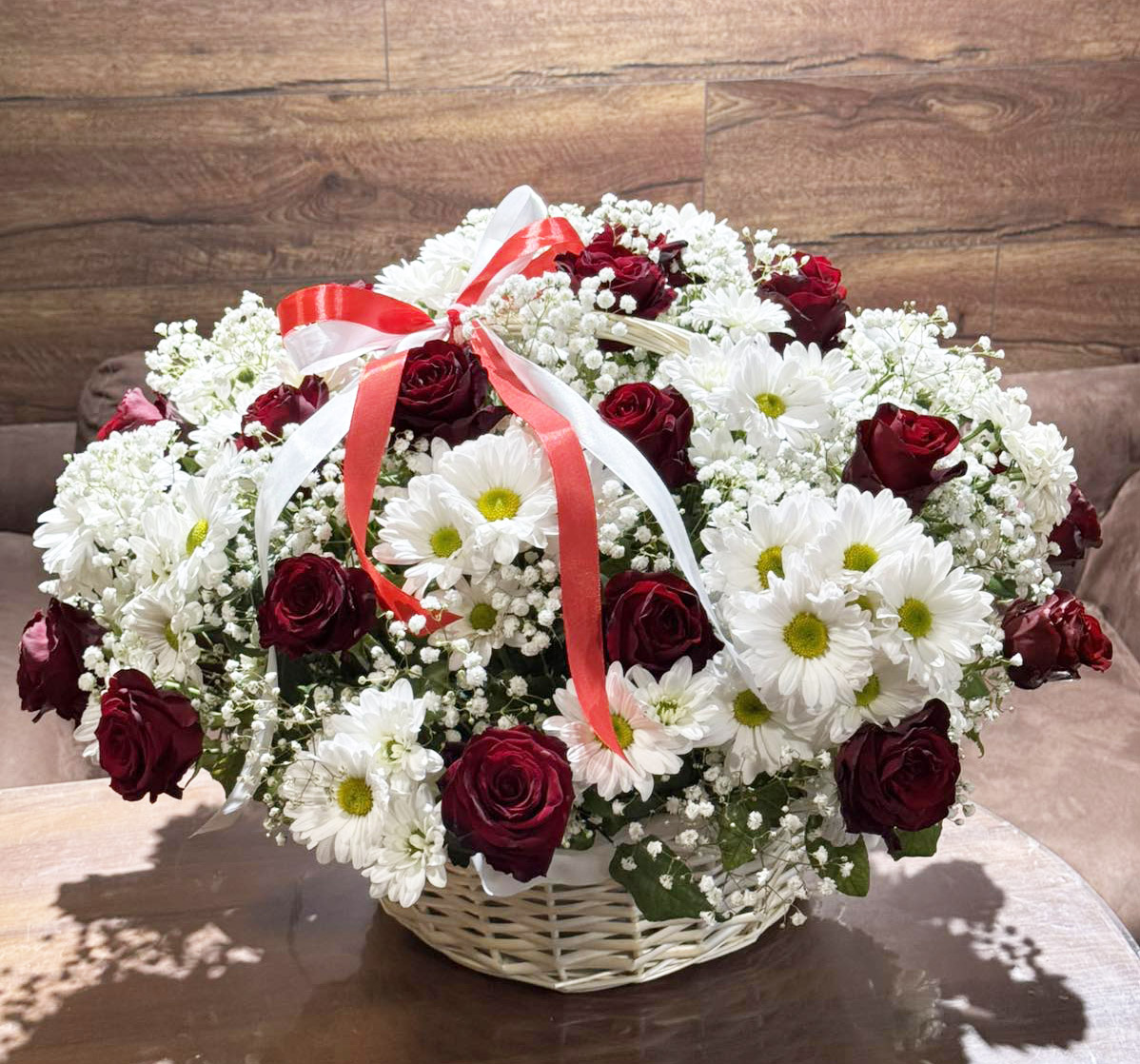 Large Basket: 25 Classic Red Roses and + 9 White Chrysanthemums' Dasies