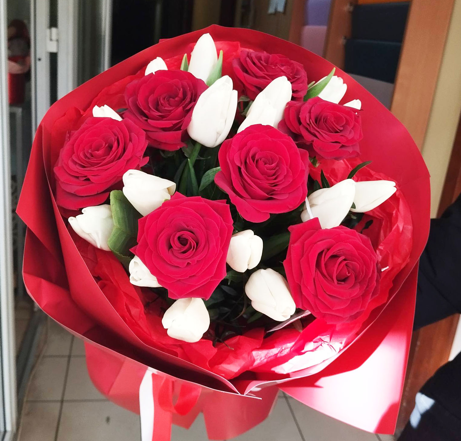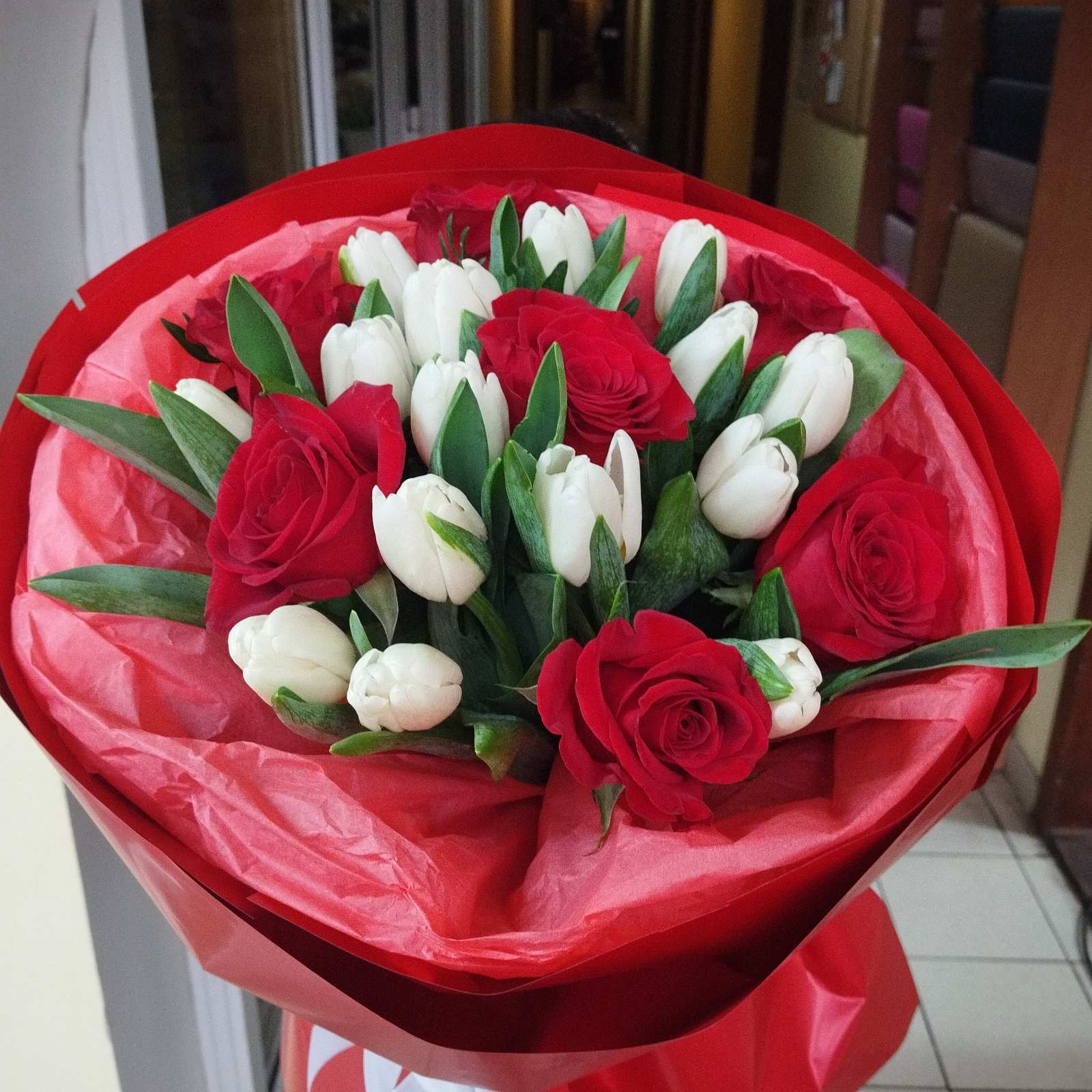 IMPORTANT : Bouquet of Bright Red or Crimson Roses and White Tulips is available apprx from January-February to April - at the tulips blossoming season. White tulips will be substituted with other cute white flowers if this bouquet is ordered at the other seasons.