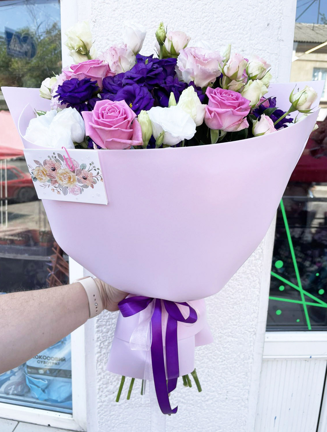 3 х ветки эустомы: розовой, белой и сиреневой 2 х крупные розовые Розы 1 х веточка кустовой розовой Розы