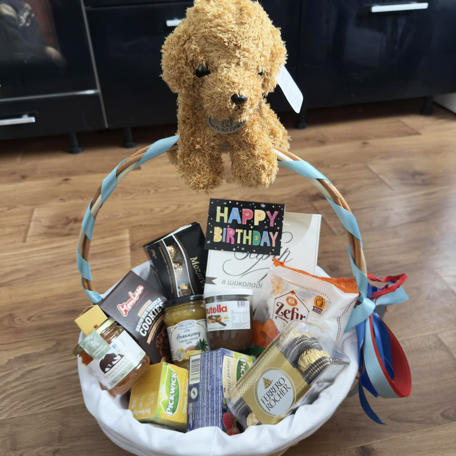 includes chocolate bar, candies, pastry, biscuits, jasmine green tea,