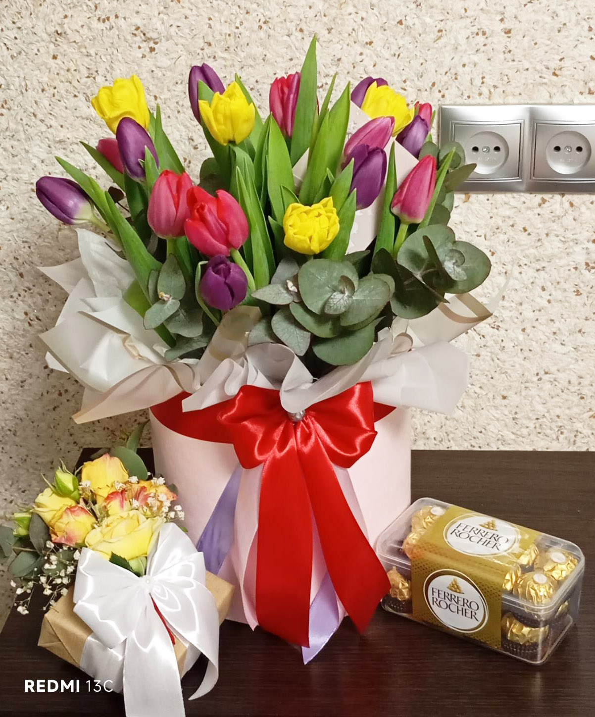 Our photo shown 27 multicolored Tulips arrangement, but we offer a smaller and bigger option.