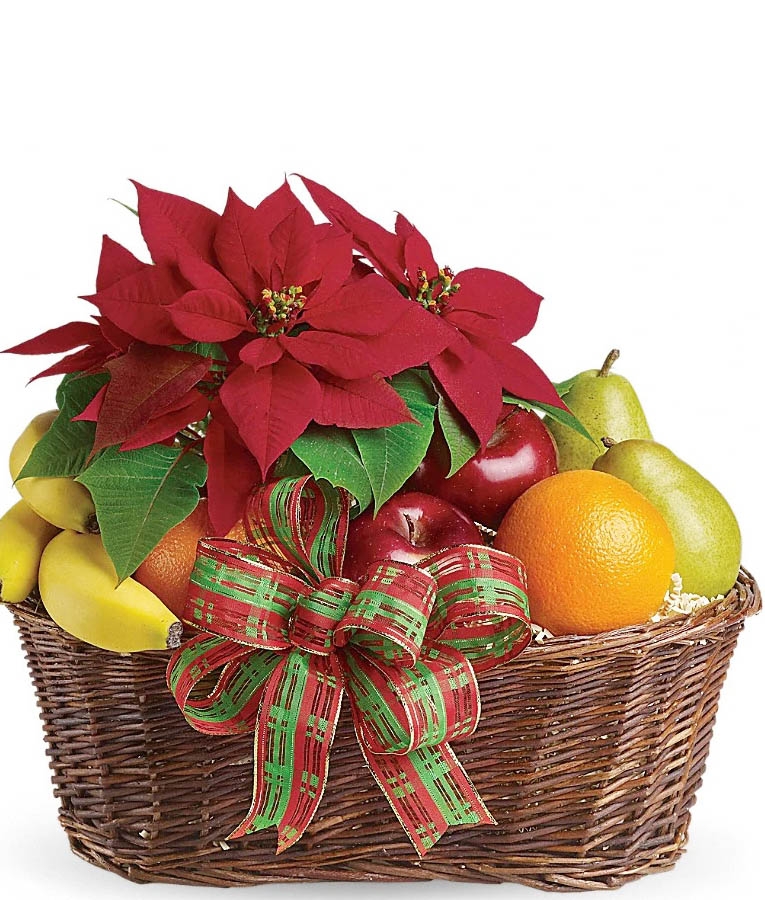 The poinsettia is immersed in a variety of 4+ kilos of the traditional winter fruits, rich in vitamins: lemons, oranges, apples, and bananas. The basket is beautifully decorated for New Year's and Christmas and would make a wonderful, delicious, and festive winter gift.