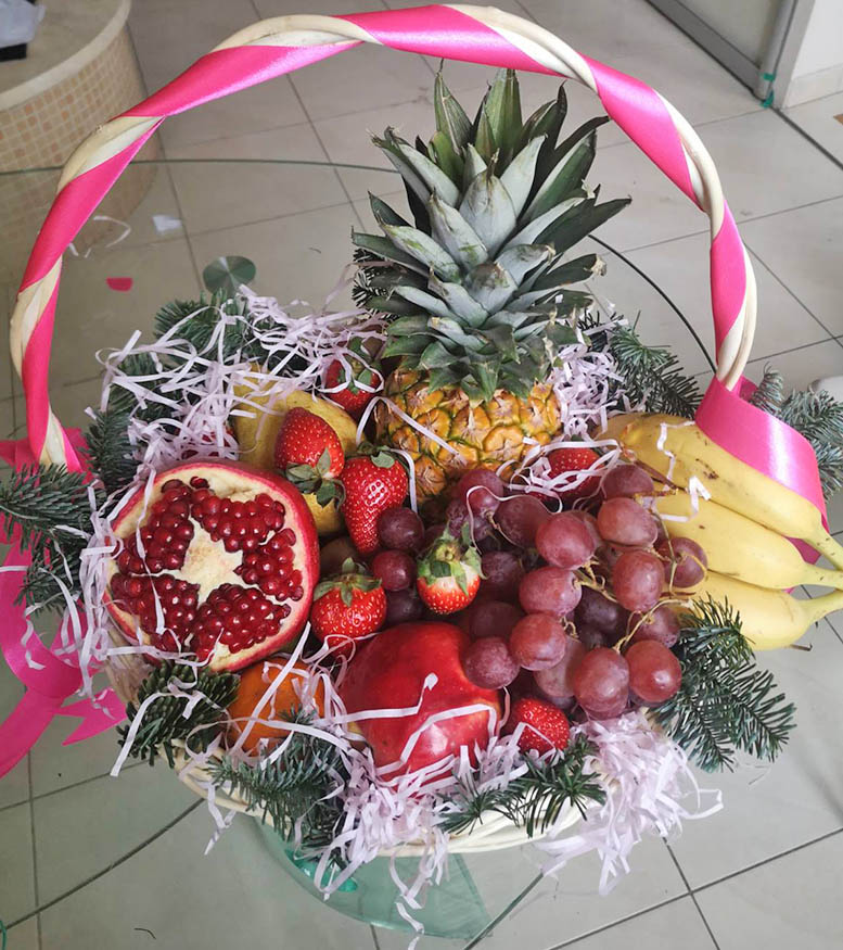 This nice and decorated basket has 3,5 kilos of fruits including some exotic ones. Each season offeres some kinds of such fruits. In Ukraine they are mostly importing from a far away countries. It's always great to get something new and unknown!We bet, that most of Ukrainians have no idea about a true test of fresh figs, feijoa and some others.