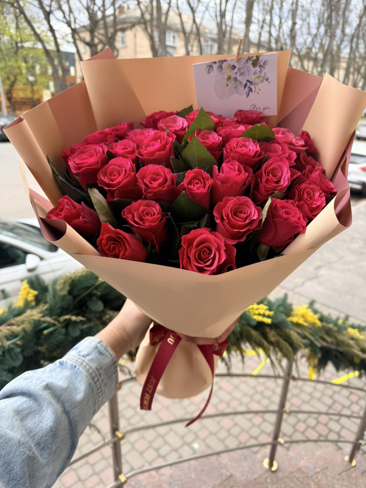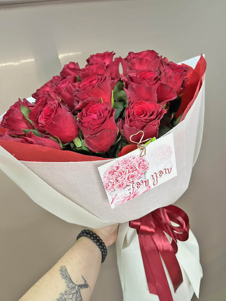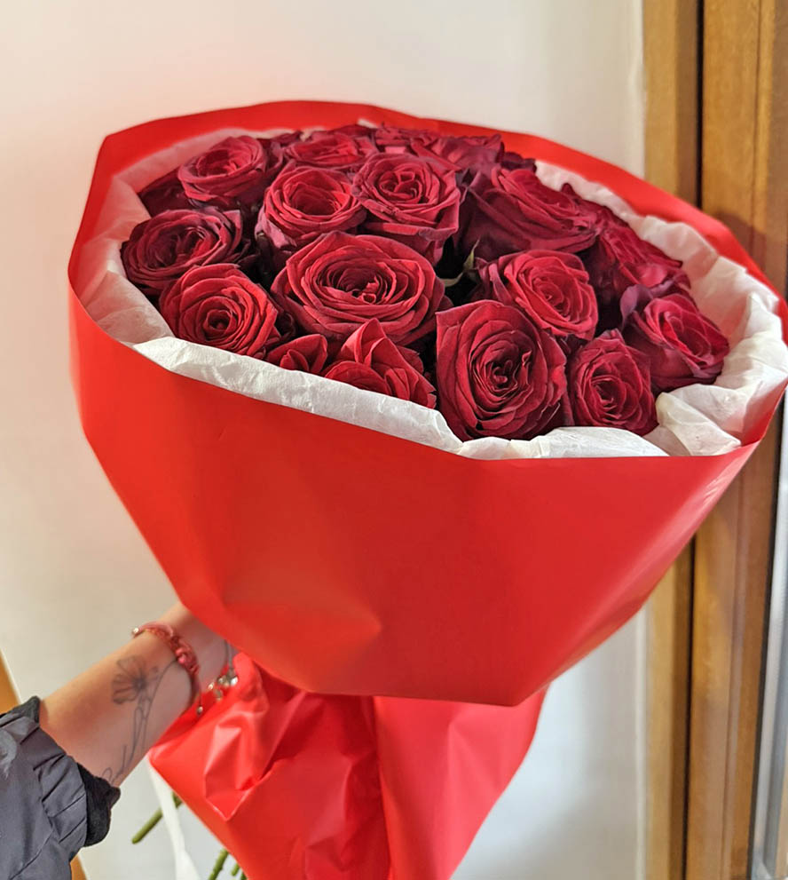 Red roses are always the best gift to show your love and romance. These are the best quality roses, the length of stems are 20-24". The bouquet design is modern, it includes ornamental foliage, beautiful packing.