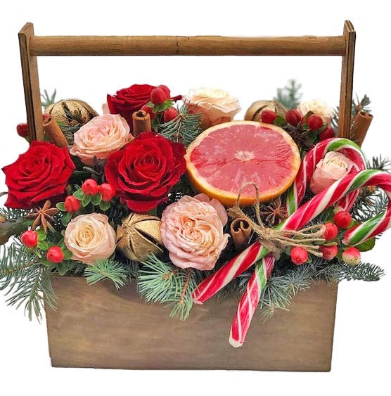 Composition is arranged at a wooden box like at our picture, or at the gift box, or at the basket (depends on the boxes selection at our flower shop at the moment)