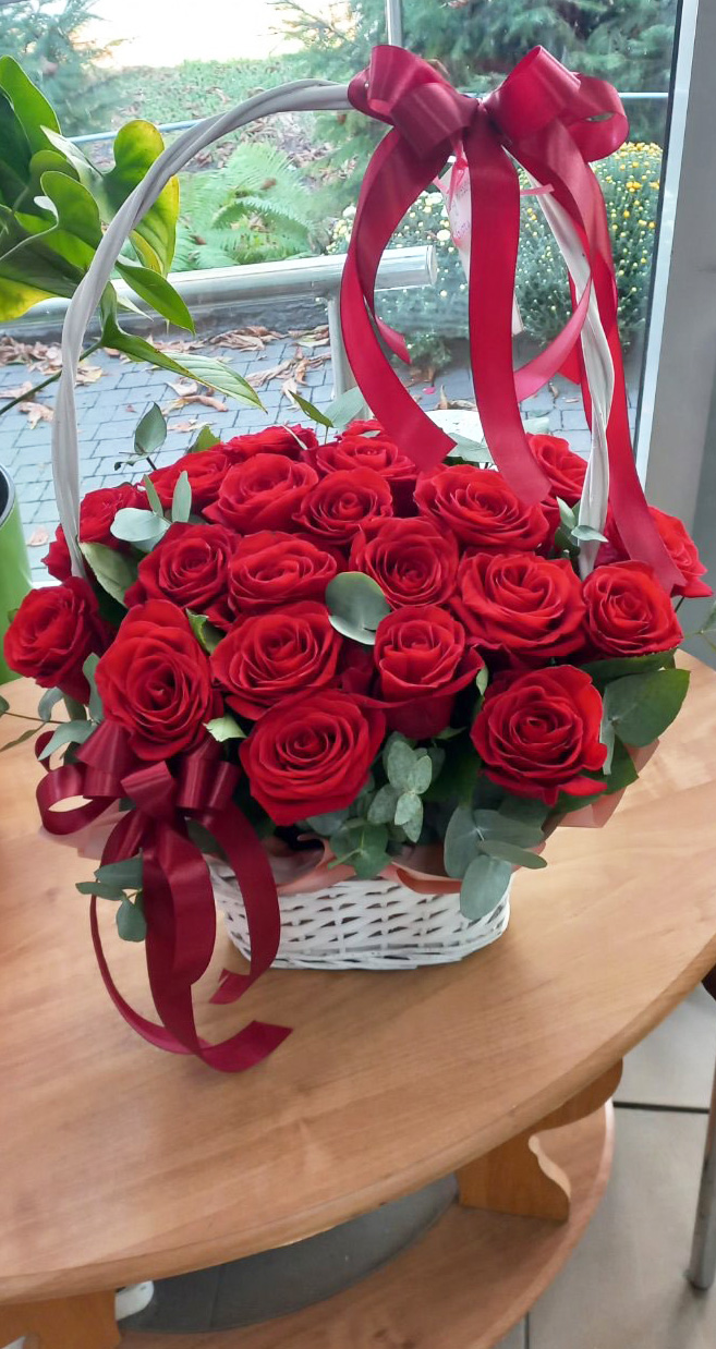 Basket of Red Classic Roses. Let us remind, that "Classic" roses are eithjer Ukraine roses of 60-70 сm or Holland/Equador roses 50-60 cm. They are approximately of the equal quality and size.