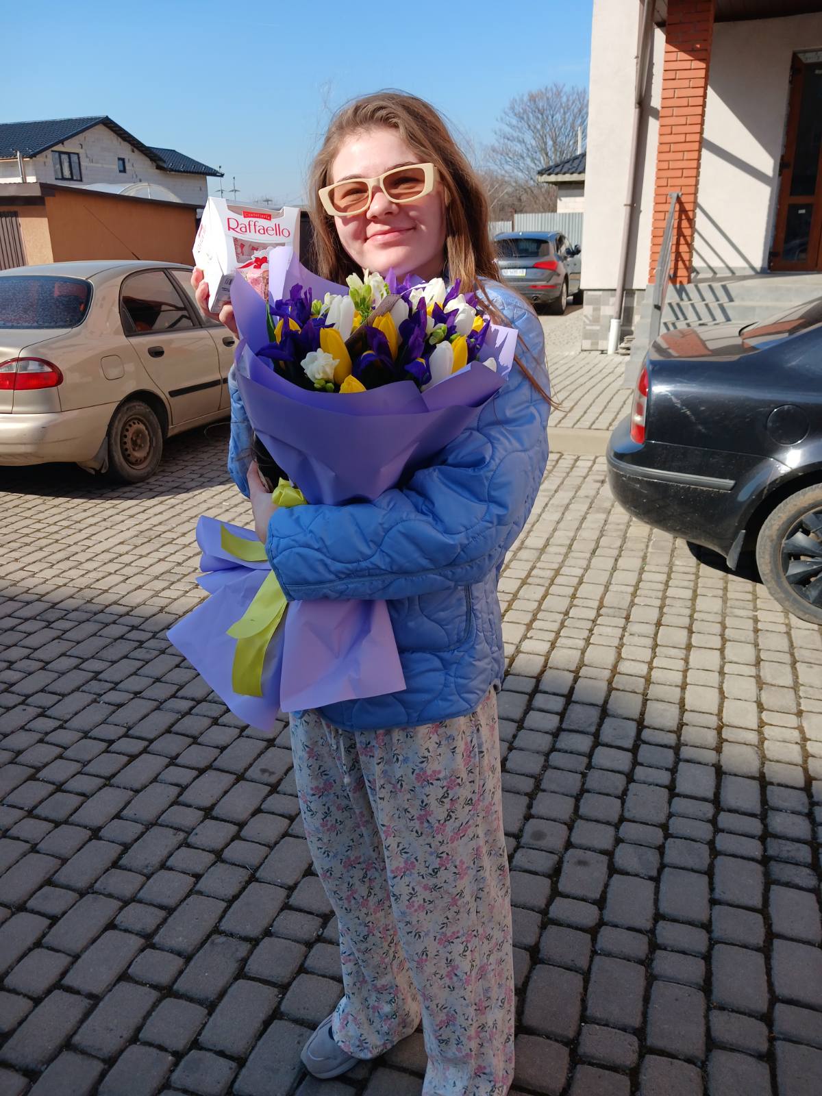 Яркий, как весеннее Солнце, букет может быть доставлен только в период примерно с января-февраля до апреля - в период цветения упомянутых весенних цветов.