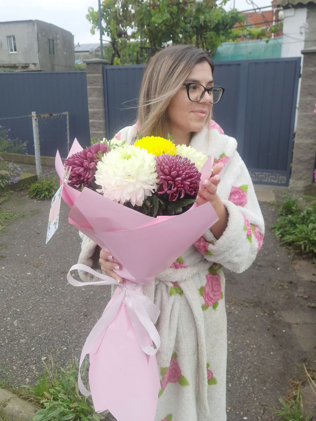 В букете на нашем фото 25 таких хризантем, но можно заказать и другое их количество.