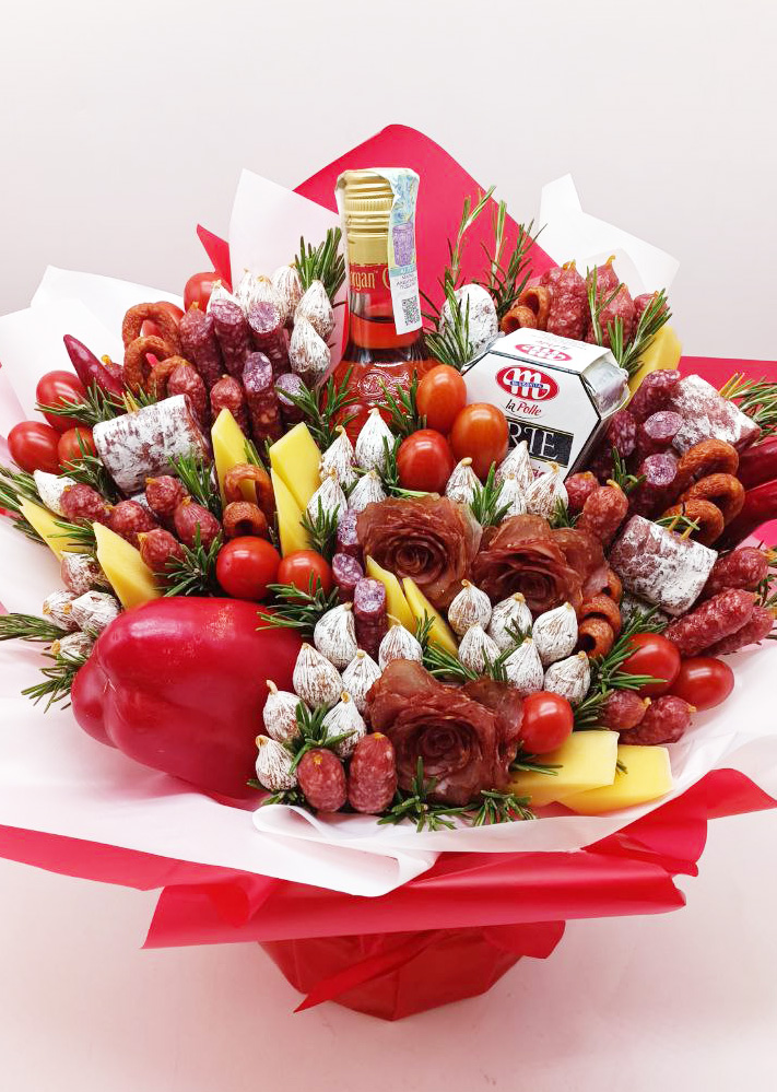 Прекрасный подарок мужчине ко дню рождения, юбилею, любому семейному празднику. Набор из нескольких видов колбасок самого высокого качества, сыр, нарезка и все этио украшают великолепные стручки красного перца.