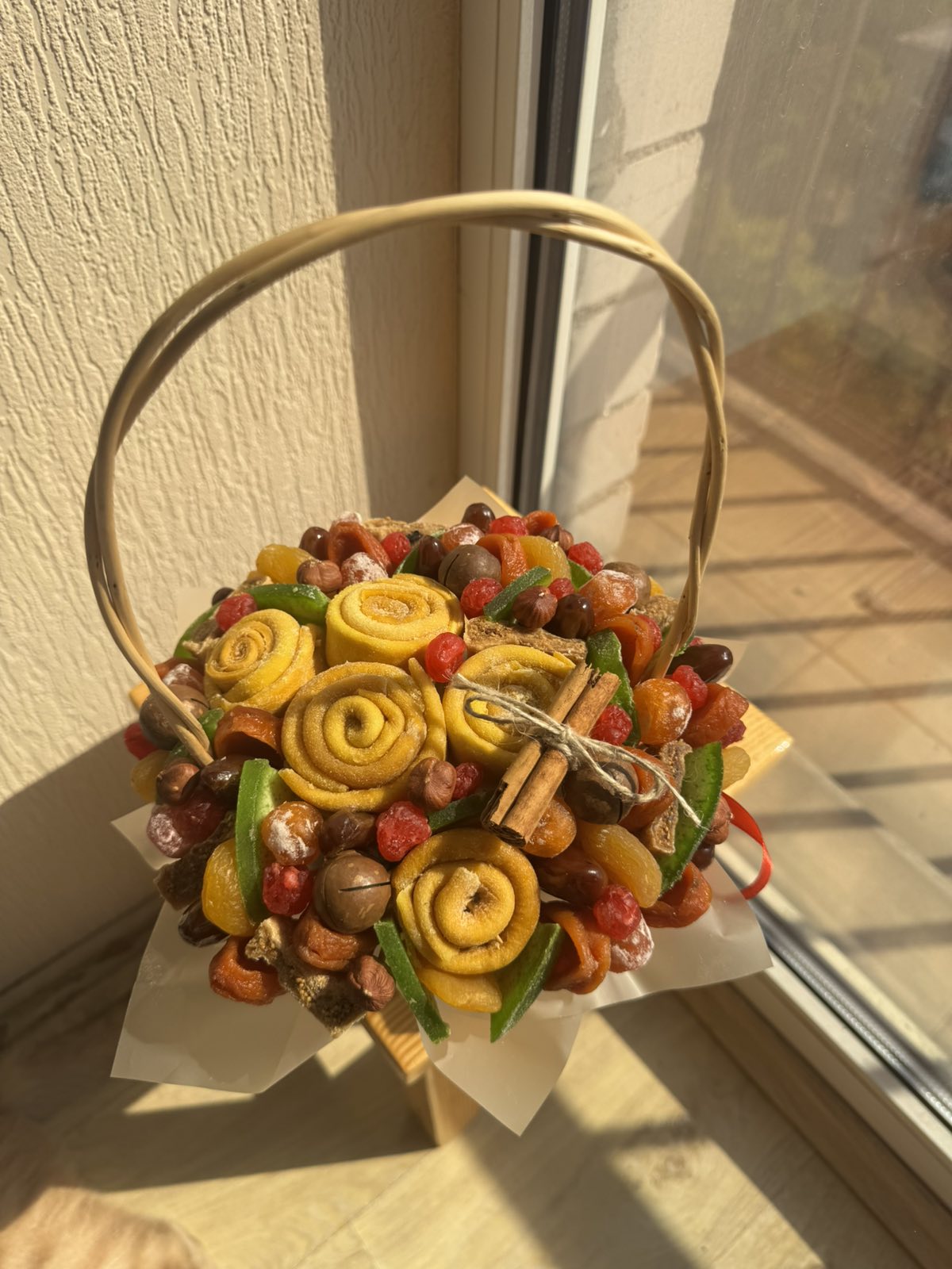 Очаровательная корзинка с яркими, красивыми цветами, сделанными с любовью из сухофруктов. Полезный, сладкий, действительно достойный подарок женщине, ребенку, мужчине, будет полезно и вкусно и молодым, и бабушкам с дедушками!