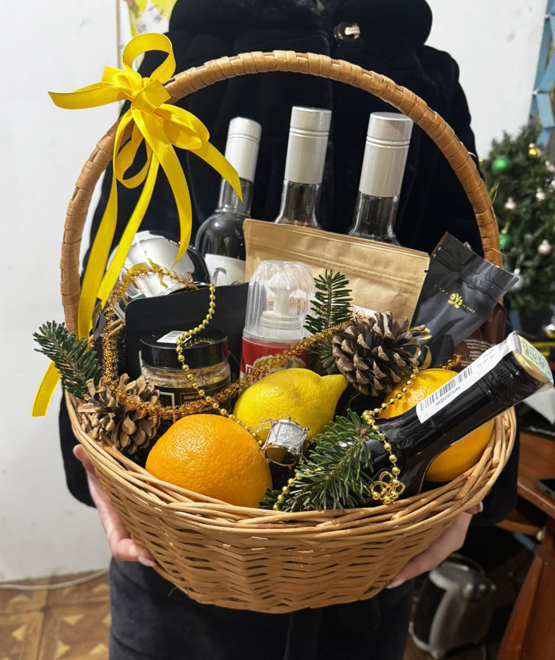 Все это будет уложено в плетеную корзину и красиво украшено.