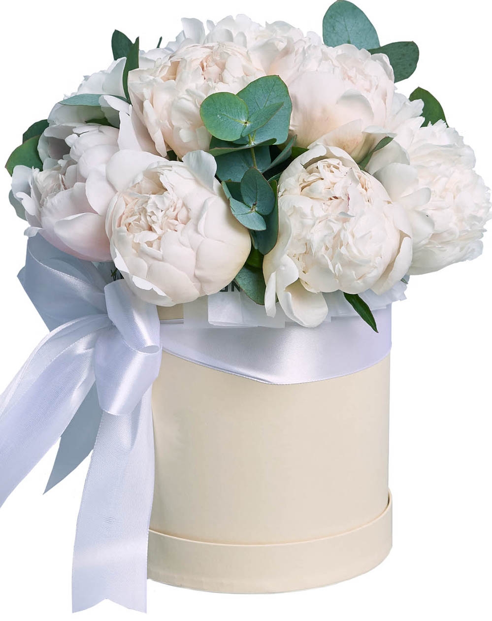 На нашей фотографии изображена композиция из 11 белых пионов в шляпной коробке, но вы можете выбрать другое их количество для своей композиции. Цвет коробки тоже может отличаться от той, что на нашем фото. Мы позаботимся о наиболее гармоничном сочетании цветов.