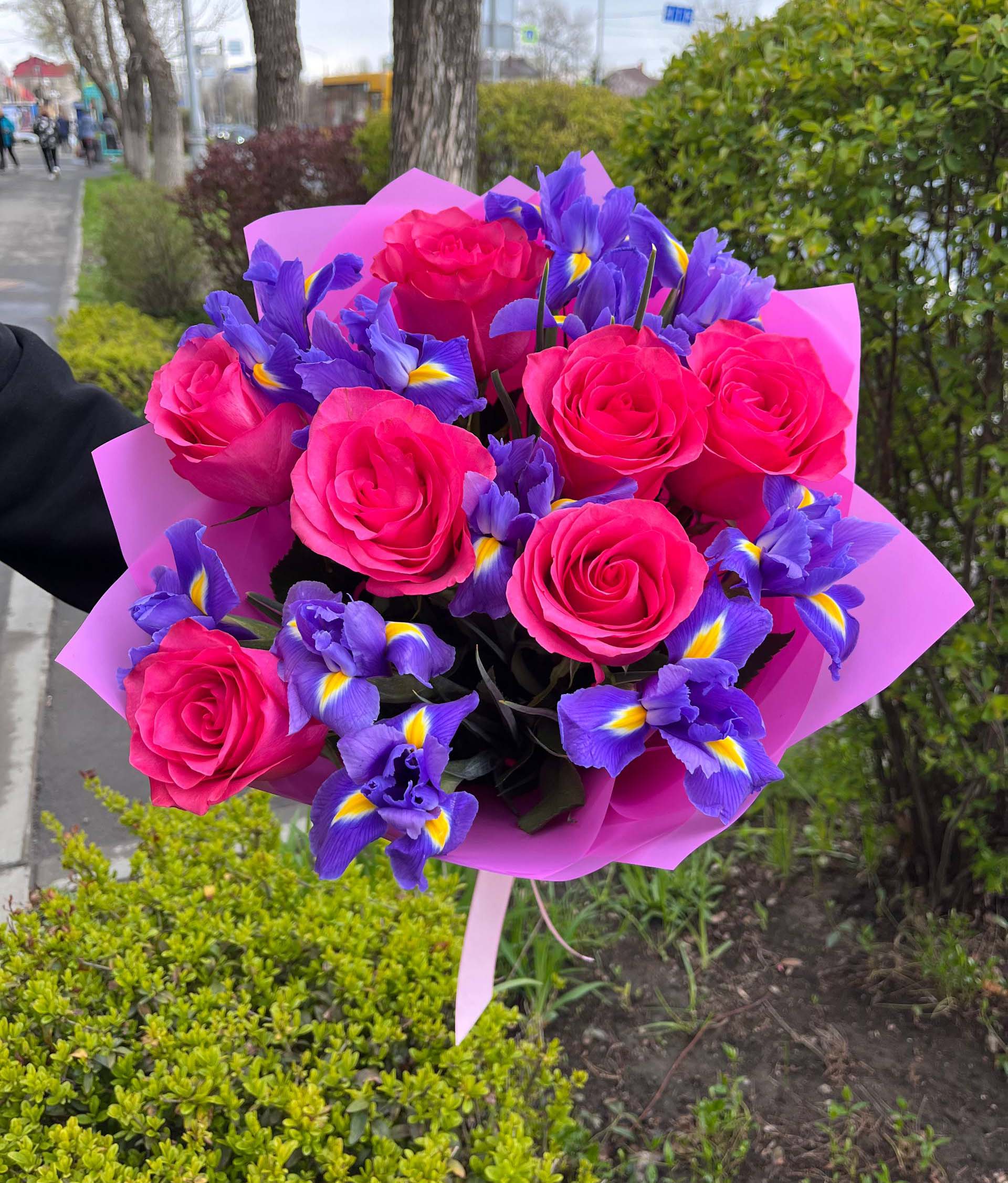На нашем фото - Большой букет розовых роз и ирисов, а вы можете выбрать как меньший, так и еще больший букет!