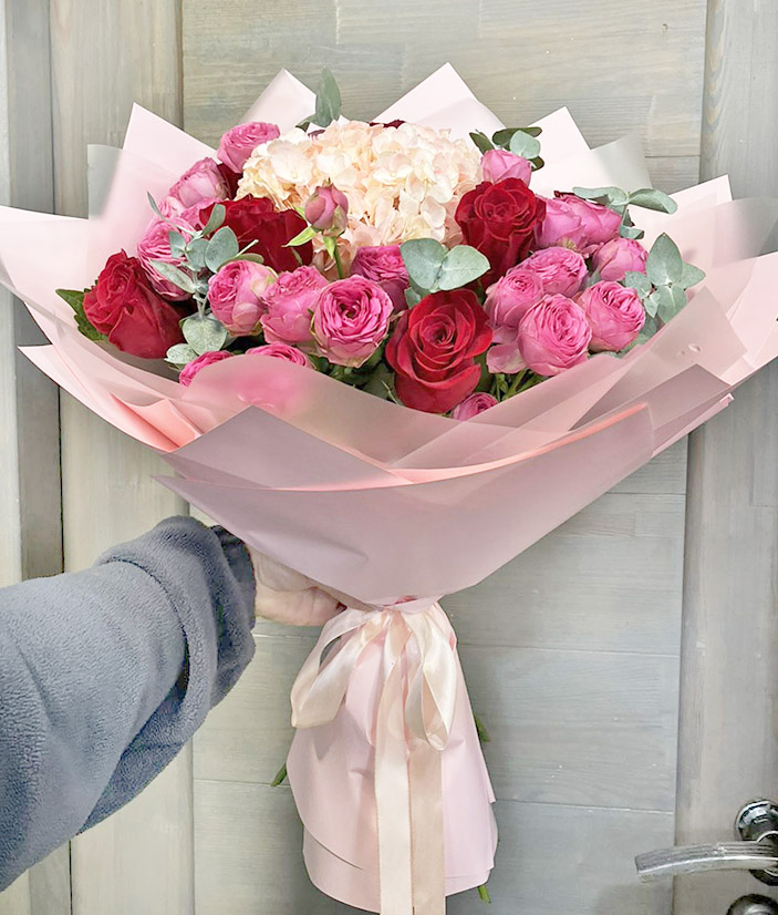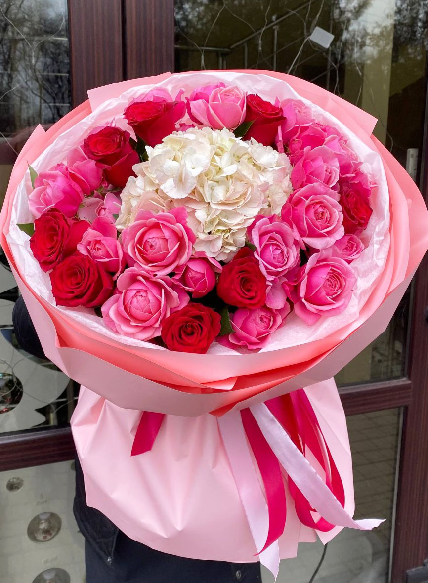1 х гортензия (иногда может быть заменена в зависимости от наличия в нашем магазине) 7 х розовых пионовидных роз (бомбастик) 8 x ярких малиновых или красных одноголовых роз