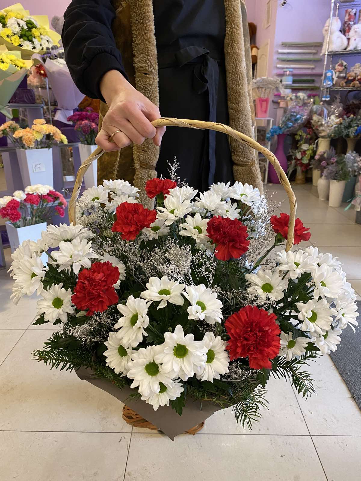 Композиция в корзине из белых хризантем и красных гвоздик. Красные гвоздики могут быть заменены красными розами, если их не будет в наличии в момент получения вашего заказа.