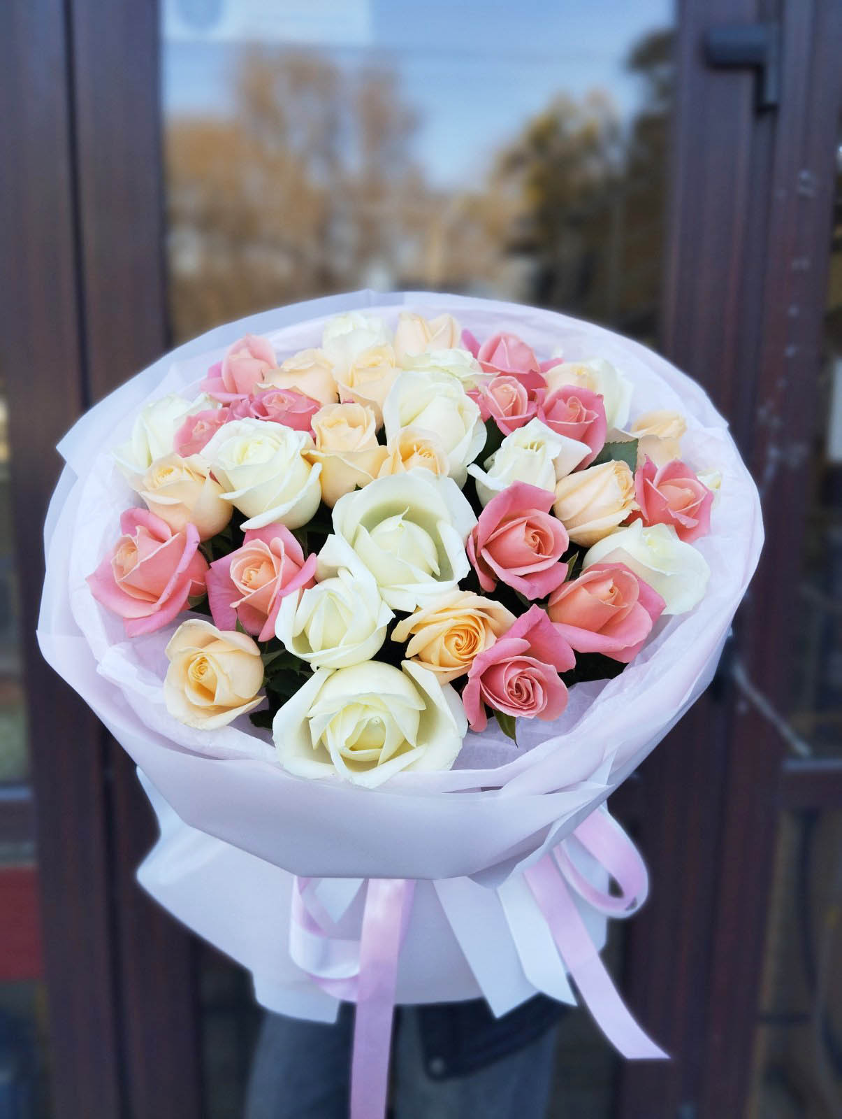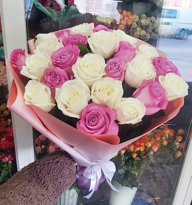 Букет белых и розовых классических роз будет красиво оформлен в современную флористическую упаковку и подвязан атласным бантом.