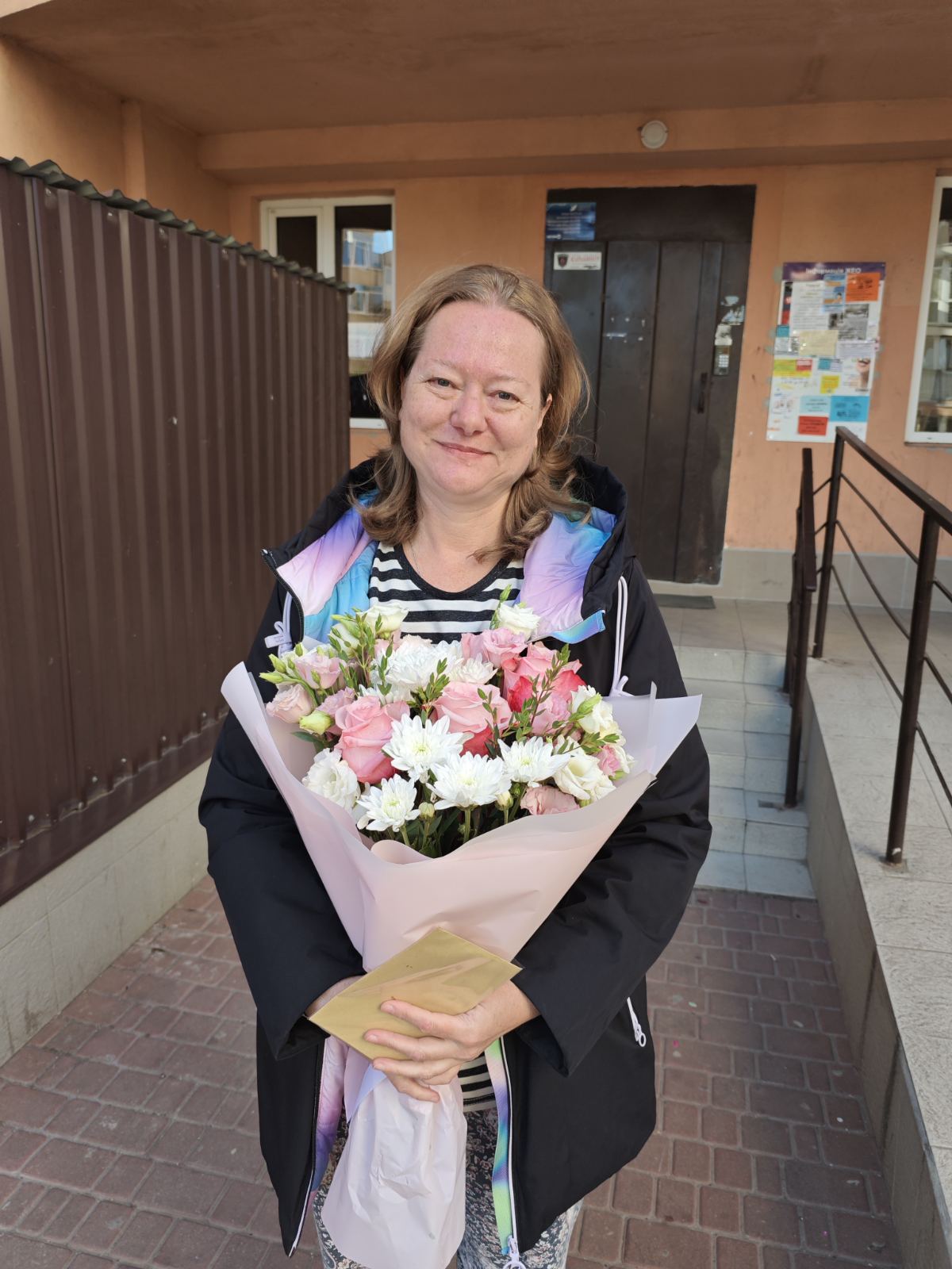 Ніжна і зворушлива композиція з 3-х Рожевих троянд, 1 біла хризантема та 5 гiлок Білих та/або рожевих альстромерій.