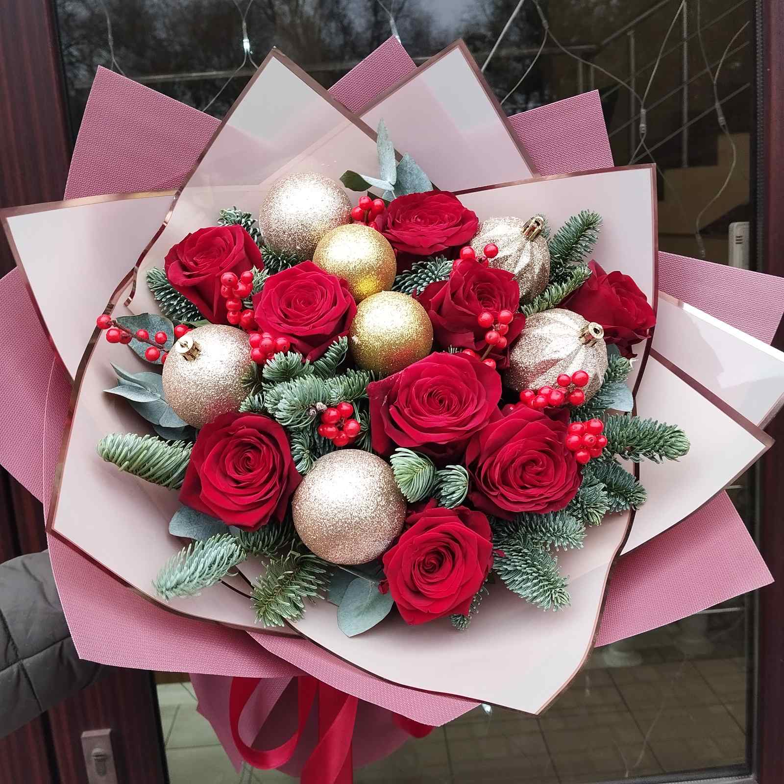 9 x червоних троянд 7 х яскравих кульок 3 x гілки гіперикуму