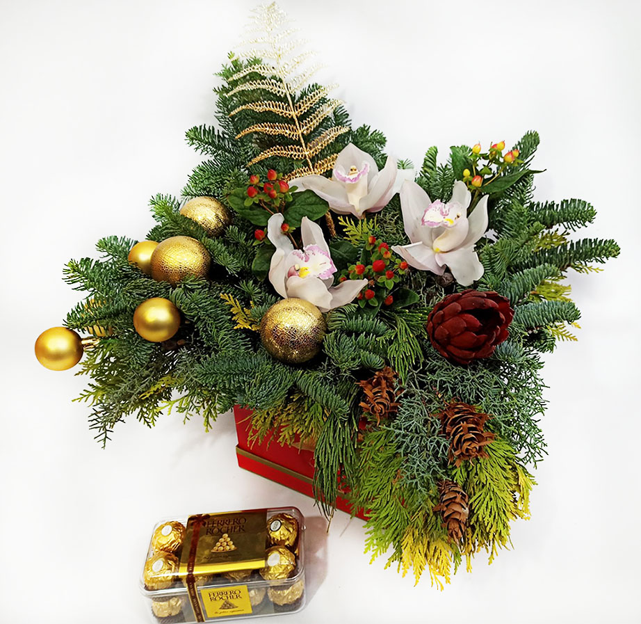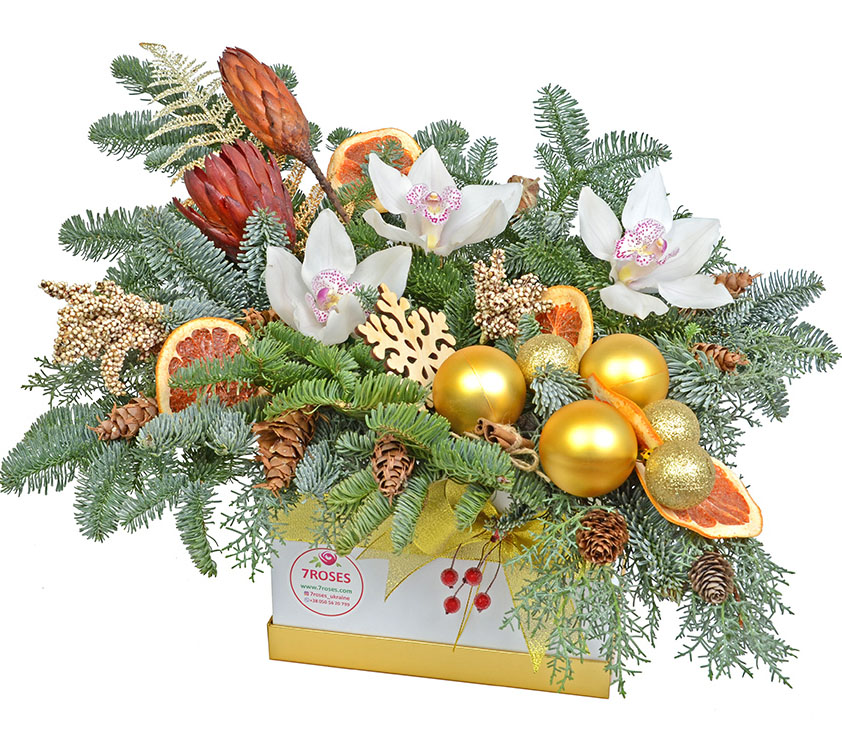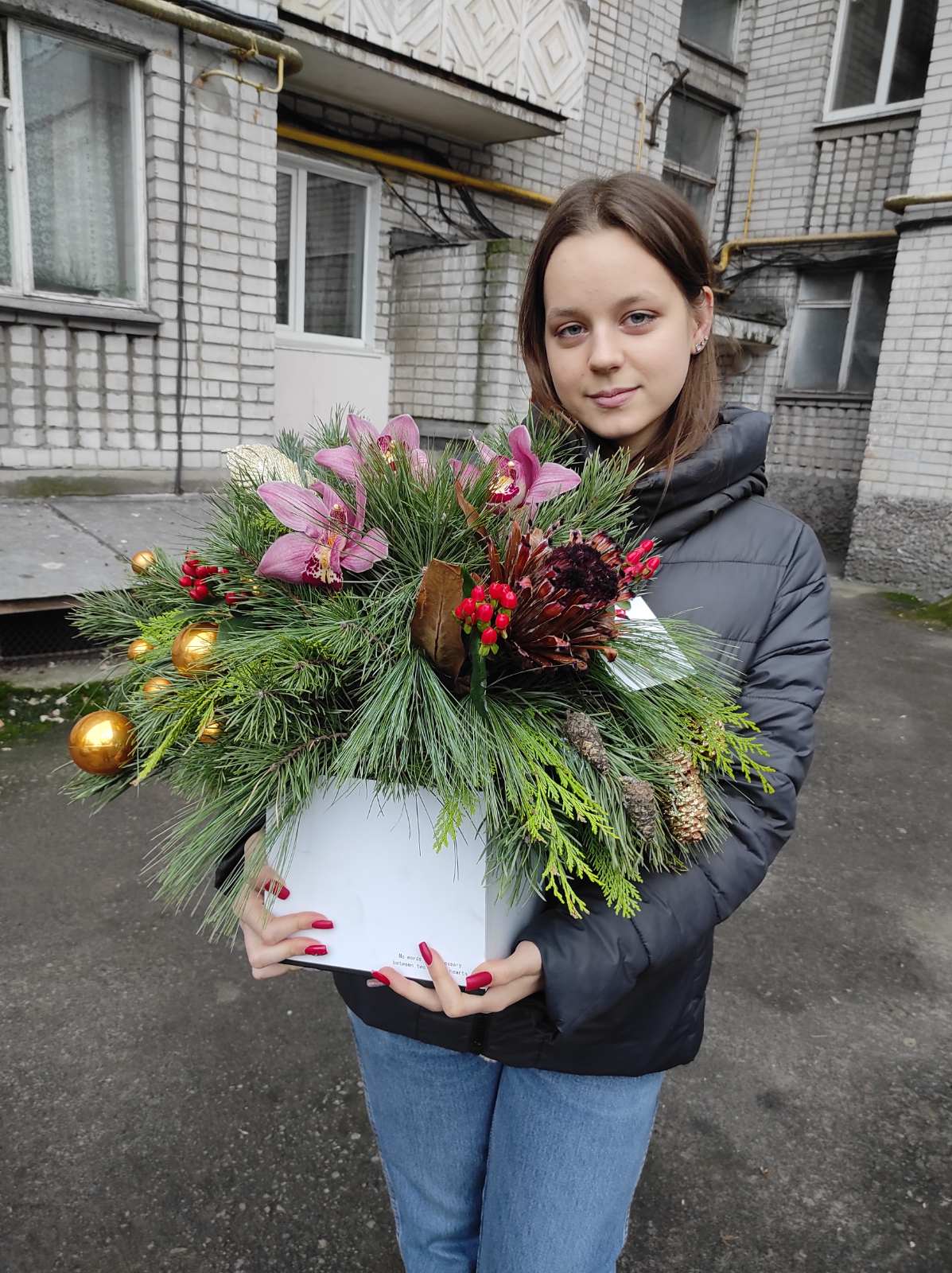 Об'ємна Новорічна композиція в подарунковій коробці, що дозволяє флористу-дизайнеру виявити свій талант та фантазію!