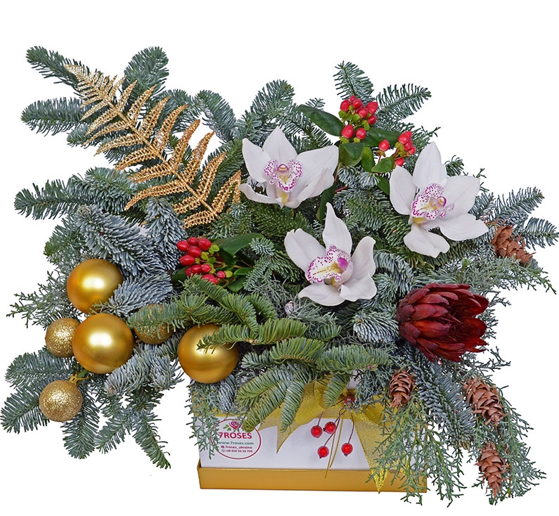 Можуть використовуватися різні Новорічні атрибути, але що там буде обов'язково - це снігові орхідеї і гілки ялини або нобілісу.