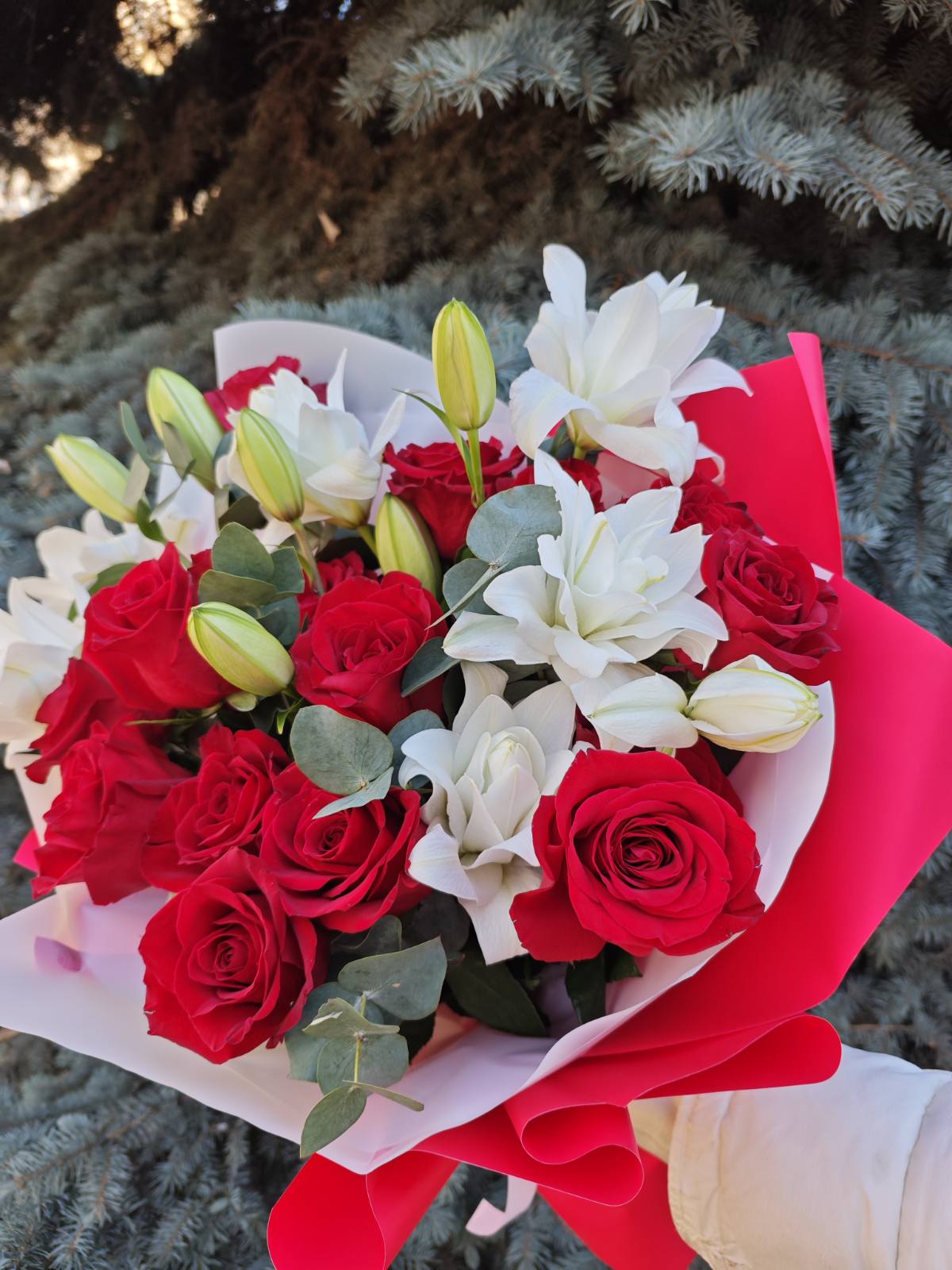 Тендітність білої лілії та червоної троянди як солодкий ранковий поцілунок прекраної діви.