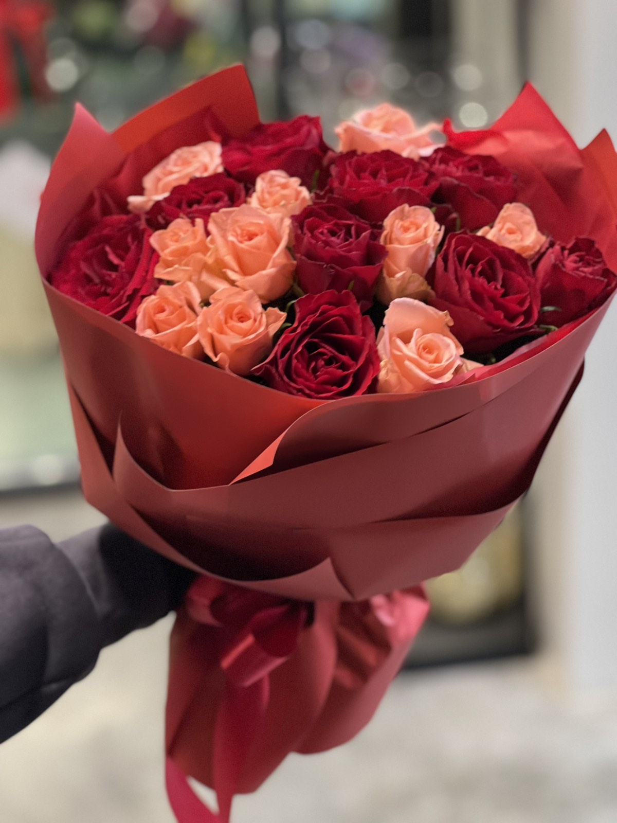 Букет червоних і рожевих класичних троянд, буде красиво оформлений в сучасну флористичну упаковку і підв'язаний атласним бантом.